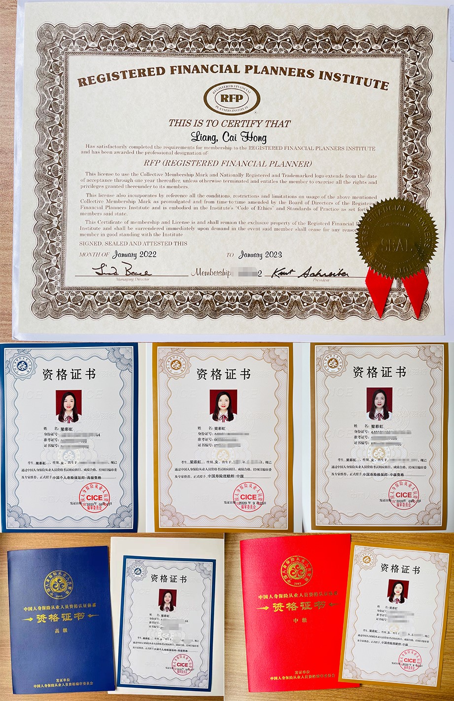期望做到保险界的“医生”和“律师”,梁彩虹除每天不间断的学习外,她还特别喜欢“考证”。过往几年中,自学考取了“中国个人寿险规划师(高级)、中国银行寿险规划师(高级)、中国寿险管理师(中级)、中国寿险核保师(中级)、中国寿险理赔师(中级)”等资格认证,今年1月-2月分别获得“RFP国际注册理财师”“FOC家族财富顾问”等资格认证。各种证件的背后,无不是其高度专业性与强大个人能力的外化表现。